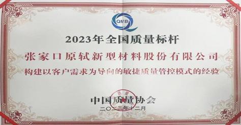 2023-12-072023年12月,張家口原軾新型材料股份有限公司憑借 “構(gòu)建以客戶需求為導向的敏捷質(zhì)量管控模式的經(jīng)驗”,榮獲2023年全國質(zhì)量標桿企業(yè)。